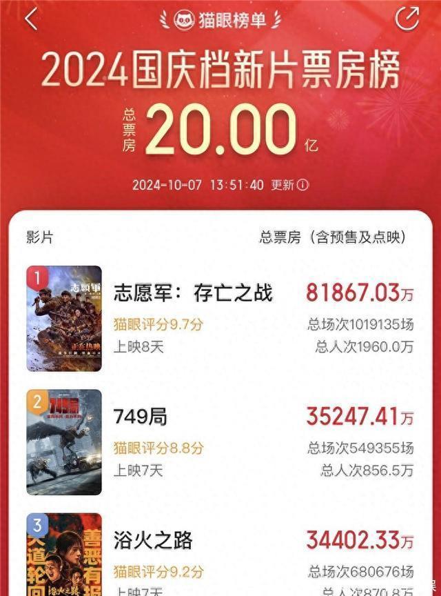 2024年十一假期,电影市集再度迎来繁华。据猫眼专科版数据,次序10月7日13时51分,2024年国庆档新片票房榜(10月1日-10月7日)破20亿,《志愿军:生死之战》《749局》《浴火之路》分各国庆档新片票房榜前三位。 10月5日,导演陆川,主演苗苗、郑恺、李俊墨携科幻剧情片《749局》来到杭州路演。